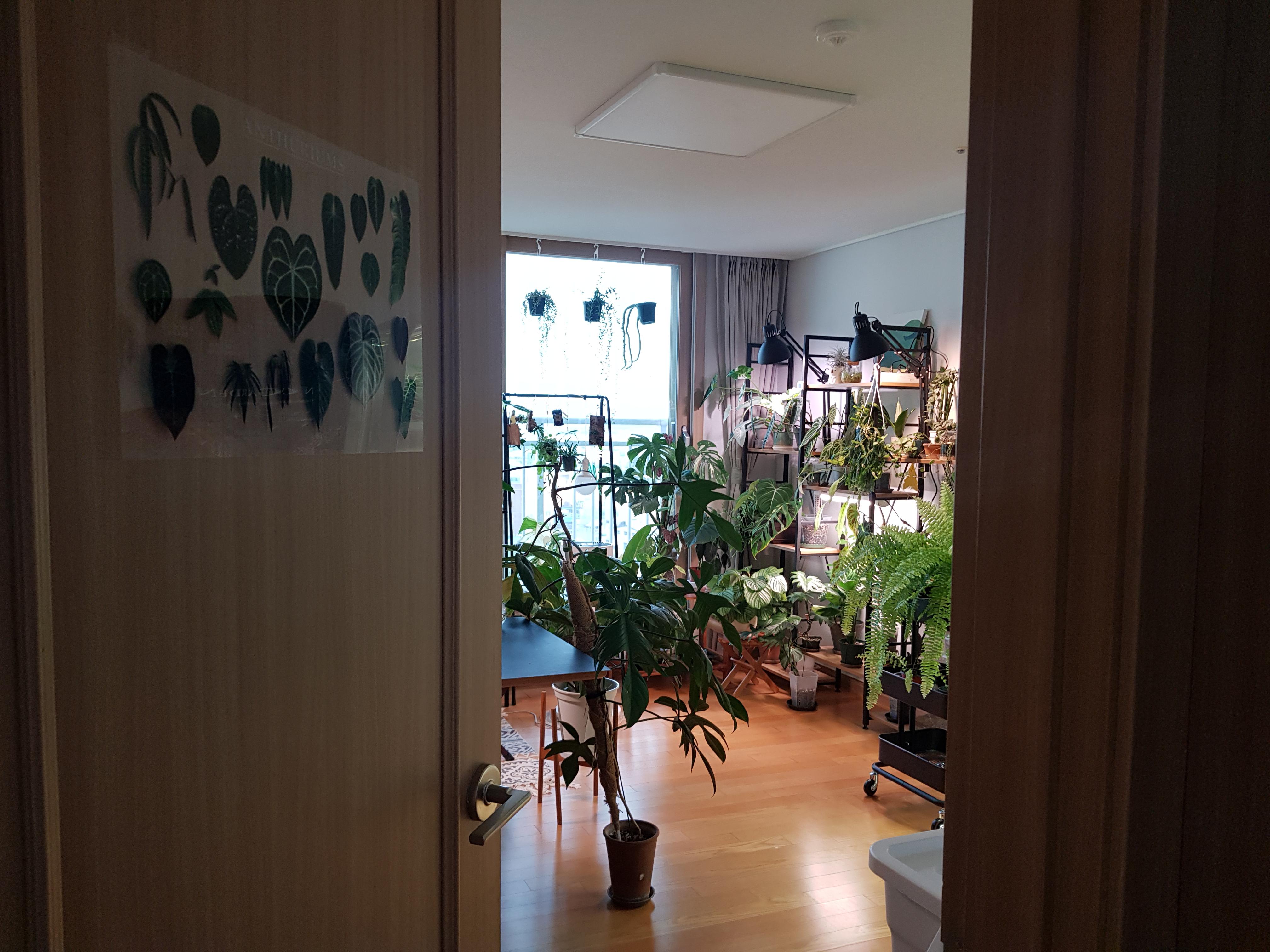 저는 전체 식물의 70% 정도를 식물 방에서 키워요. 나머지는 베란다와 거실에서 키우고요. 재작년부터 습도 조절을 하기 위해서 식물 방을 따로 만들었어요. 남편은 건조한 걸 좋아하는데 거실은 같이 쓰는 공간이라 습도를 높이기 어렵잖아요. 그래서 식물 방을 만들었죠. 처음에는 습도를 높이기 위해 식물 방에 가습기를 썼는데 지금은 식물 수가 워낙 많다 보니 가습기를 안 써도 증산작용 때문에 습도 유지가 잘 돼요.