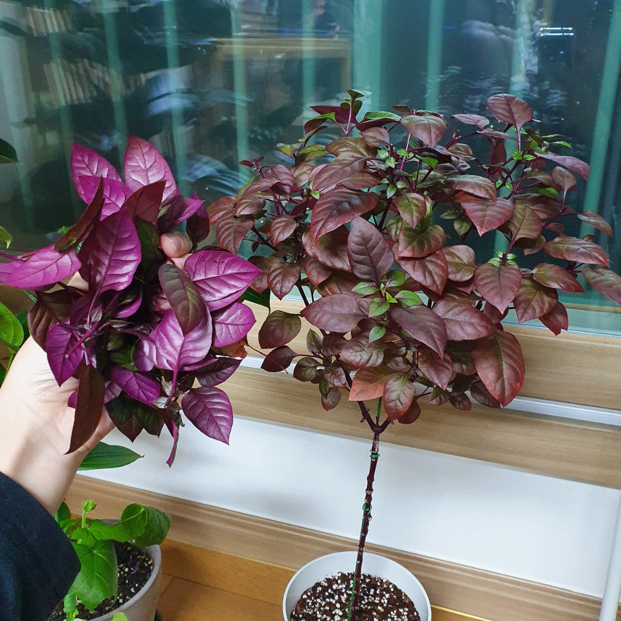 제가 키우는 식물을 몇 가지 소개해드릴게요. ‘퍼플 프린스’라는 식물은 빛을 많이 받으면 초록색에서 보라색으로 변하는 게 신기해요. 보라 왕자라는 이름에 잘 어울리죠.