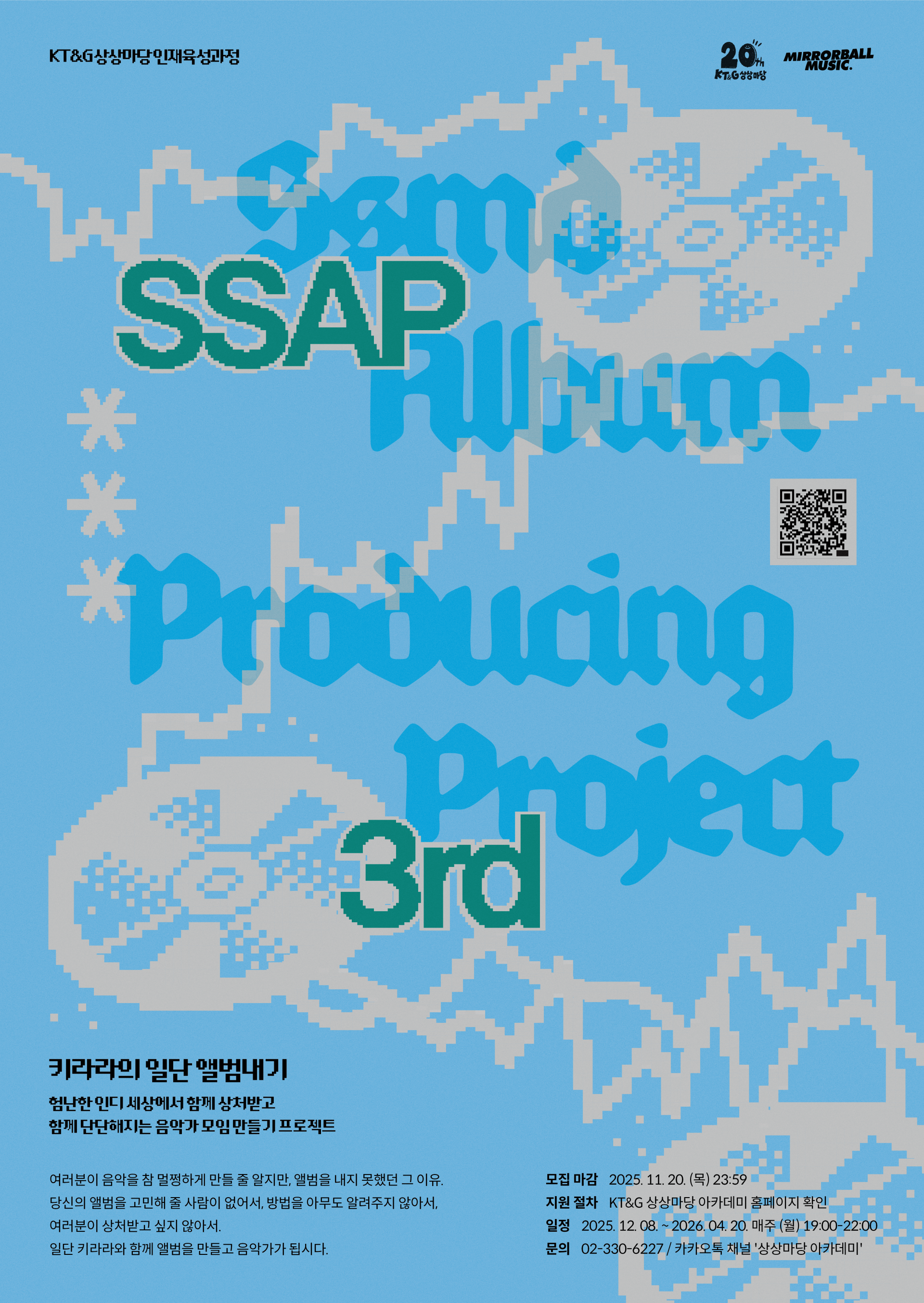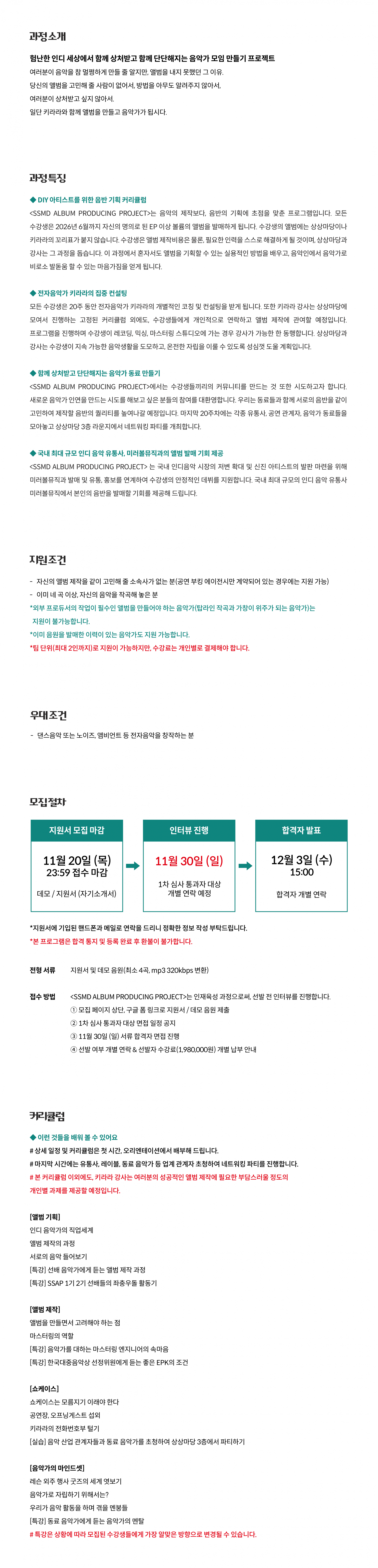 키라라의 일단 앨범내기 2기, 키라라의 일단 앨범내기, SSAP, SSMD ALBUM PRODUCING PROJECT, 미러볼뮤직, 험난한 인디 세상에서 함께 상처받고 함께 단단해지는 음악가 모임 만들기 프로젝트여러분이 음악을 참 멀쩡하게 만들 줄 알지만, 앨범을 내지 못했던 그 이유.당신의 앨범을 고민해 줄 사람이 없어서, 방법을 아무도 알려주지 않아서,여러분이 상처받고 싶지 않아서.일단 키라라와 함께 앨범을 만들고 음악가가 됩시다.과정 특징◆ DIY 아티스트를 위한 음반 기획 커리큘럼<SSMD ALBUM PRODUCING PROJECT>는 음악의 제작보다, 음반의 기획에 초점을 맞춘 프로그램입니다. 모든 수강생은 2025년 6월까지 자신의 명의로 된 EP 이상 볼륨의 앨범을 발매하게 됩니다. 수강생의 앨범에는 상상마당이나 키라라의 꼬리가 붙지 않습니다. 수강생은 앨범 제작비용은 물론 필요한 인력을 스스로 해결하게 될 것이며, 상상마당과 강사는 그 과정을 돕습니다. 이 과정에서 펀딩이나 지원 사업을 통한 발매가 아닌, 한정된 예산과 조건에서도 앨범을 기획할 수 있는 실용적인 방법을 배우고, 음악인에서 음악가로 비로소 발돋움 할 수 있는 마음가짐을 얻게 됩니다.** 강사 역시 본 프로그램을 진행하며 앨범을 만듭니다. (2025년 2월 키라라 정규 5집 발매 예정)◆ 전자음악가 키라라의 집중 컨설팅모든 수강생은 20주 동안 전자음악가 키라라의 개별적인 코칭 및 컨설팅을 받게 됩니다. 또한 키라라 강사는 상상마당에 모여서 진행하는 고정된 커리큘럼 외에도, 수강생들에게 개인적으로 연락하고 앨범 제작에 관여할 예정입니다. 프로그램을 진행하며 수강생이 레코딩, 믹싱, 마스터링 스튜디오에 가는 경우 강사가 가능한 한 동행합니다. 상상마당과 강사는 수강생이 지속 가능한 음악생활을 도모하고, 온전한 자립을 이룰 수 있도록 성심껏 도울 계획입니다.◆ 함께 상처받고 단단해지는 음악가 동료 만들기<SSMD ALBUM PRODUCING PROJECT>에서는 수강생들끼리의 커뮤니티를 만드는 것 또한 시도하고자 합니다. 새로운 음악가 인연을 만드는 시도를 해보고 싶은 분들의 참여를 대환영합니다. 우리는 동료들과 함께 서로의 음반을 같이 고민하여 제작할 음반의 퀄리티를 높여나갈 예정입니다. 마지막 20주차에는 각종 유통사, 공연 관계자, 음악가 동료들을 모아놓고 상상마당 3층 라운지에서 네트워킹 파티를 개최합니다.◆ 국내 최대 규모 인디 음악 유통사, 미러볼뮤직과의 앨범 발매 기회 제공<SSMD ALBUM PRODUCING PROJECT>는 국내 인디음악 시장의 저변 확대 및 신진 아티스트의 발판 마련을 위해 미러볼뮤직과 발매 및 유통, 홍보를 연계하여 수강생의 안정적인 데뷔를 지원합니다. 국내 최대 규모의 인디 음악 유통사 미러볼뮤직에서 본인의 음반을 발매할 기회를 제공해 드립니다전형 방식지원 조건자신의 앨범 제작을 같이 고민해 줄 소속사가 없는 분(공연 부킹 에이전시만 계약되어 있는 경우에는 지원 가능합니다.)이미 네 곡 이상, 자신의 음악을 작곡해 놓은 분* 외부 프로듀서의 작업이 필수인 앨범을 만들어야 하는 음악가(탑라인 작곡과 가창이 위주가 되는 음악가)는 지원이 불가능합니다.* 이미 음원을 발매한 이력이 있는 음악가도 지원 가능합니다.* 팀 단위(최대 2인 까지)로 지원이 가능하지만, 수강료는 개인별로 결제해야 합니다.우대 조건댄스음악 또는 노이즈, 앰비언트 등 전자음악을 창작하는 분