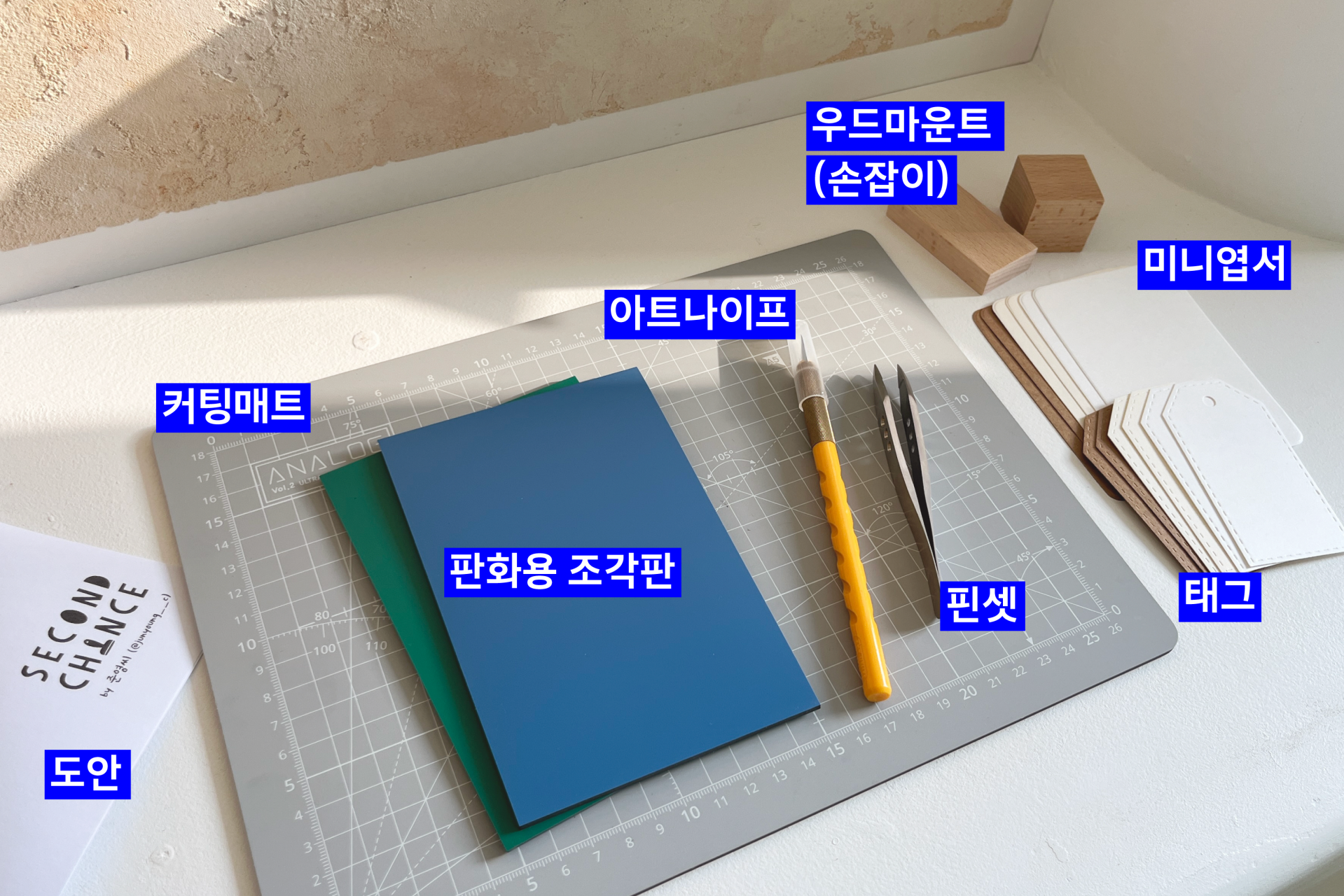 | [가져가도 되는 재료] 도안, 판화용 PVC 조각판, 우드마운트(손잡이), 린넨 파우치, 미니엽서, 태그 등 |