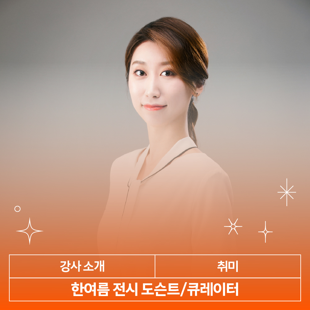 직접 쌓아온 비전공자의 도슨트 도전 경험을 바탕으로, 작품을 관찰하고 해석하는 법, 효과적으로 설명하는 스토리텔링 전략, 그리고 실제 도슨트 스크립트 작성까지 짧게 경험할 수 있습니다. 작품을 보고, 말하고, 관객과 소통하는 과정을 직접 경험하며, 도슨트가 되고 싶은 분이나 자신의 작품을 더 잘 전달하고 싶은 예술가 모두에게 도움이 될 수 있는 강의입니다. _ 한여름 강사
