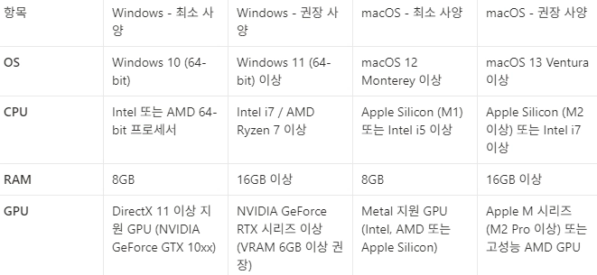 * 노트북 기술 사양 안내 (윈도우 - 최소사양 중 내장그래픽 해당 x) |